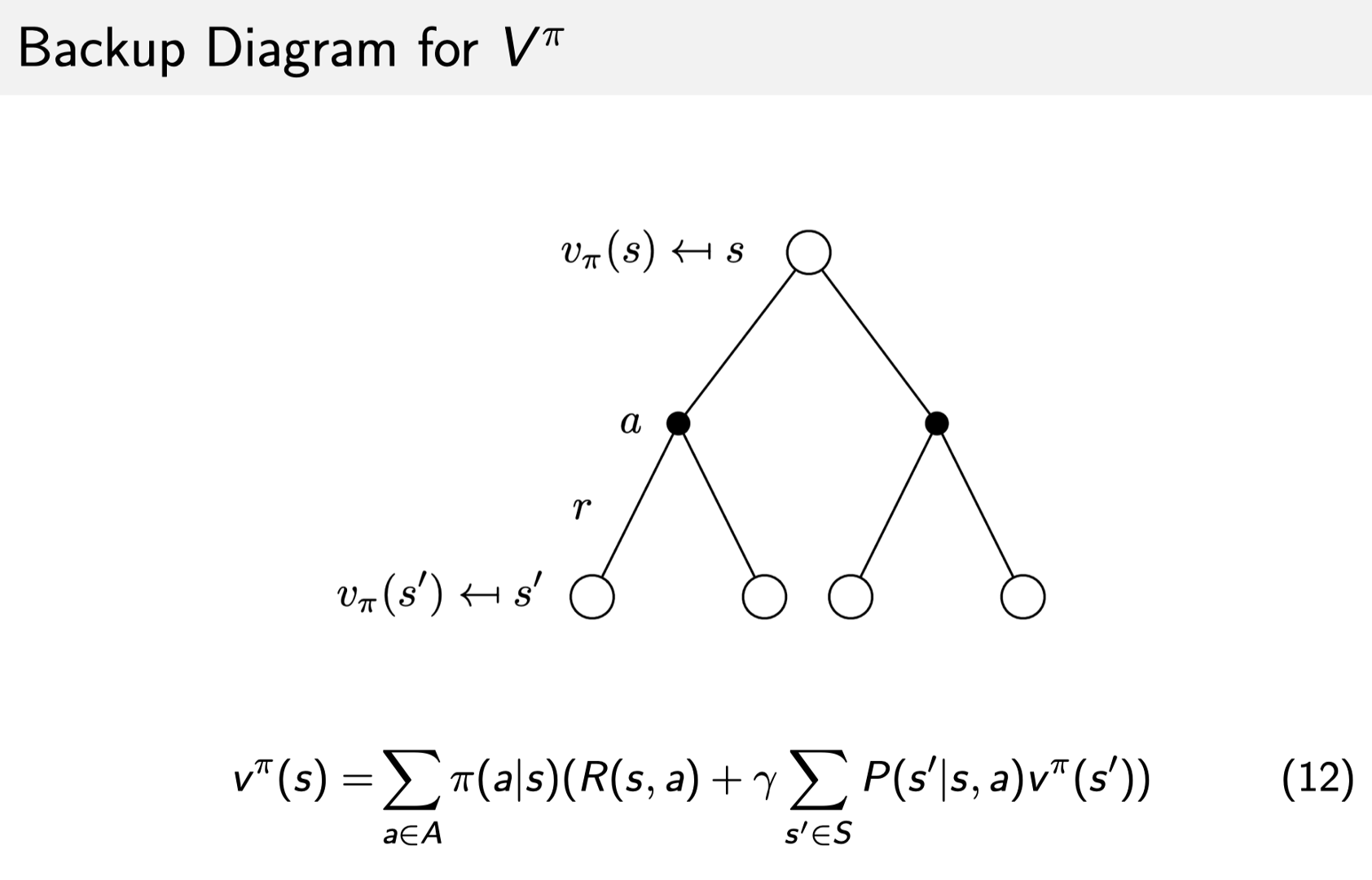 v_{t}^{\pi}(s)=\sum_{a} P(\pi(s)=a)\left(r(s, a)+\gamma \sum_{s^{\prime} \in S} P\left(s^{\prime} \mid s, a\right) v_{t-1}^{\pi}\left(s^{\prime}\right)\right)
