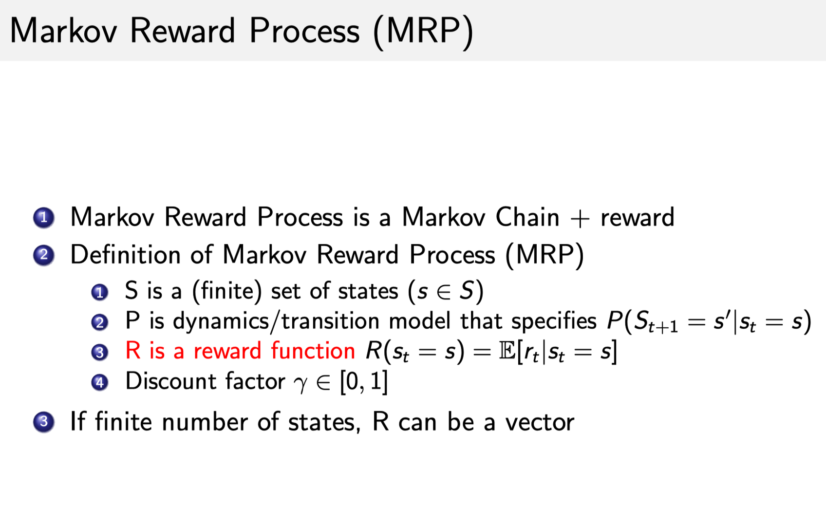 我们再来看一看马尔可夫奖励过程(Markov Reward Process, MRP)。MRP 是马尔可夫链再加上了一个奖励函数。在 MRP中转移矩阵跟它的这个状态都是跟马尔可夫链一样的多了一个奖励函数(reward function)奖励函数是一个期望,就是说当你到达某一个状态的时候,可以获得多大的奖励,然后这里另外定义了一个 discount factor \gamma