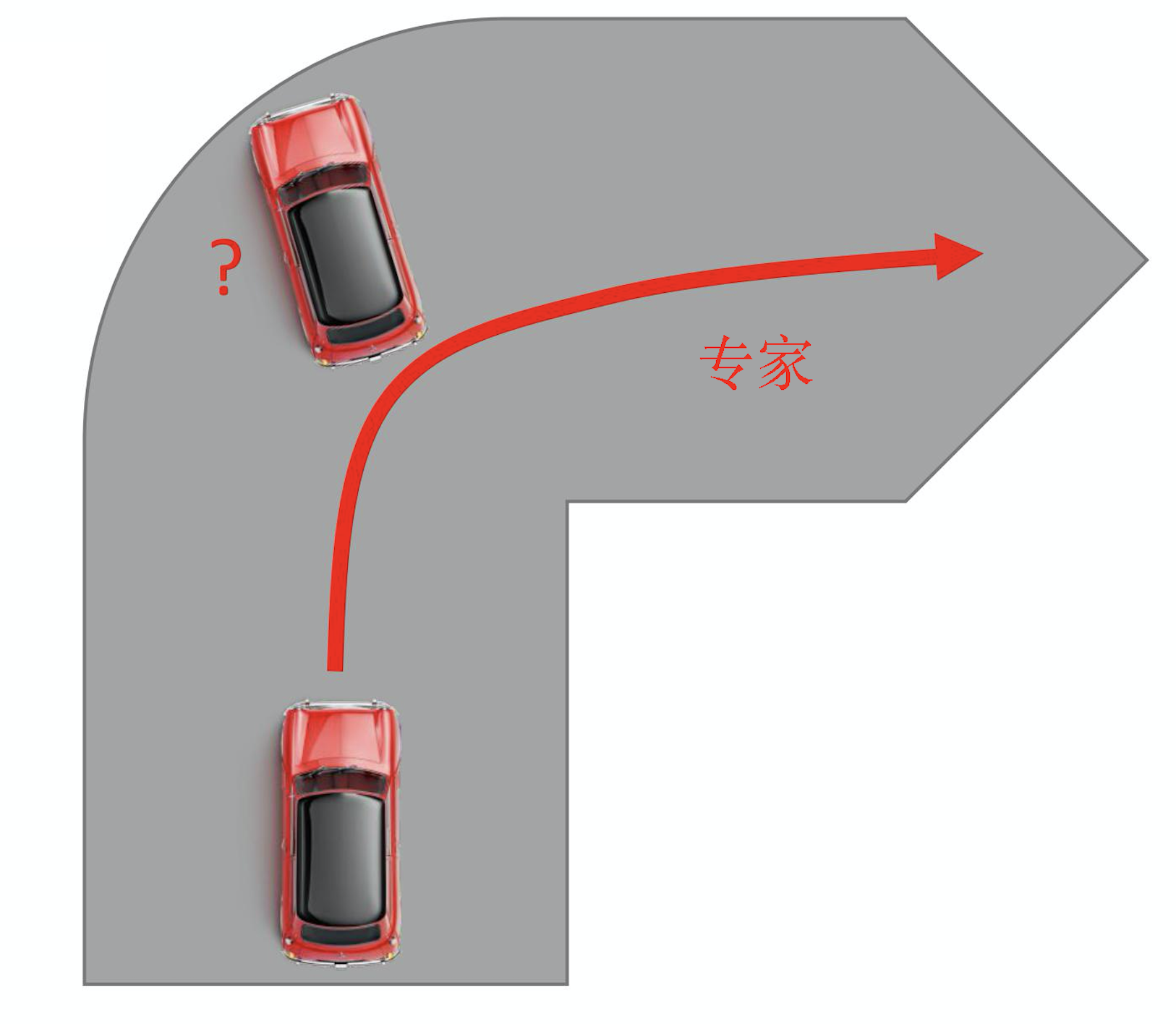 行为克隆虽然非常简单,但它的问题是,如果我们只收集专家的示范,可能我们看过的观测以及状态是非常有限的。例如,如图 11.2 所示,假设我们要学习自动驾驶一辆汽车通过图中的弯道。如果是专家,它将顺着红线通过弯道。但假设智能体很笨,它开车的时候撞墙了,它永远不知道撞墙这种状况要怎么处理。因为训练数据里面从来没有撞墙相关的数据,所以它根本就不知道撞墙这种情况要怎么处理。打电玩也是一样的,让专家去玩《超级马里奥》,专家可能非常强,它从来不会跳不上水管,所以智能体根本不知道跳不上水管时要怎么处理。所以仅仅使用行为克隆是不够的,只观察专家的示范是不够的,还需要结合另一个方法:数据集聚合(dataset aggregation,DAgger)。