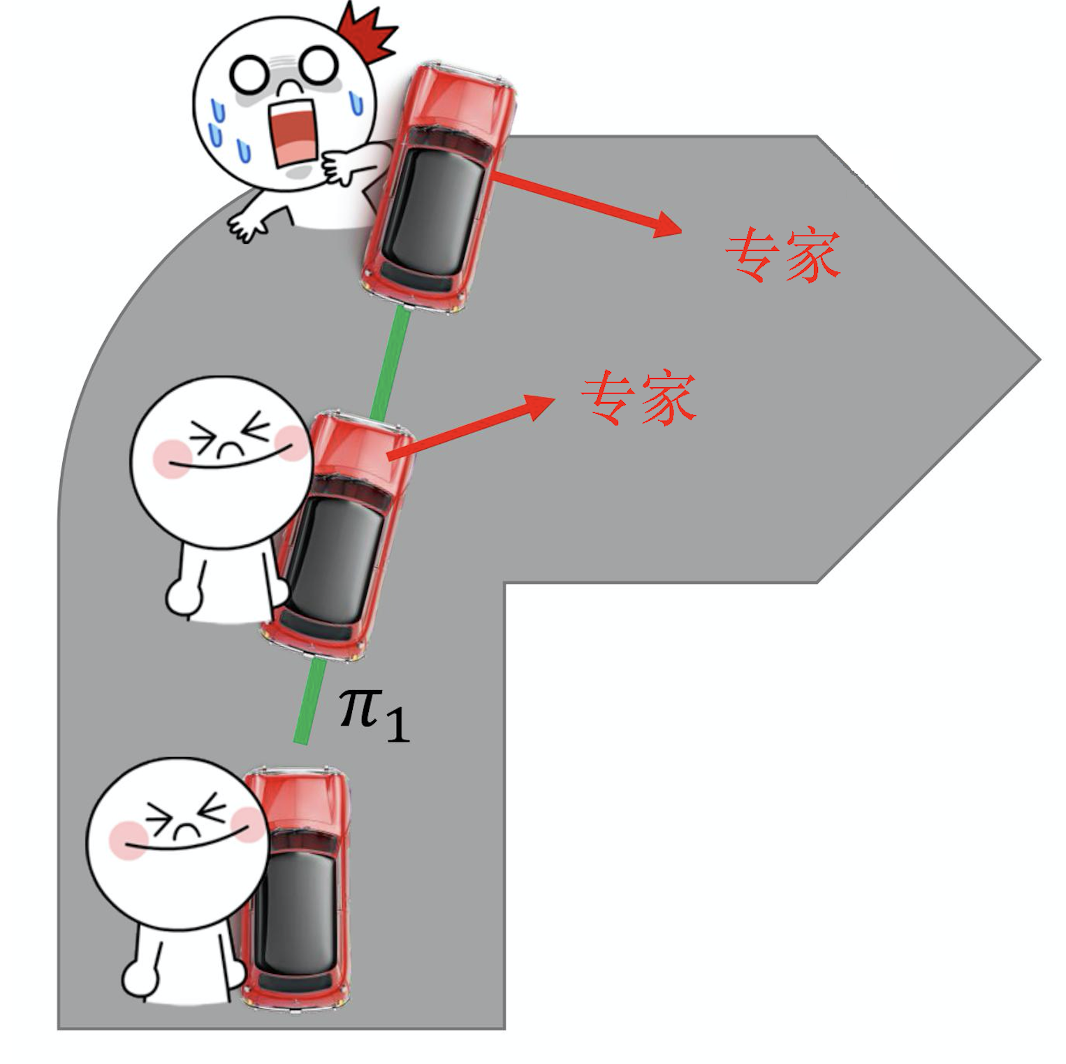 我们希望收集更多样的数据,而不是只收集专家所看到的观测。我们希望能够收集专家在各种极端的情况下所采取的行为。如图 11.3 所示,以自动驾驶汽车为例,一开始我们有演员 $\theta_1$,并且让其去驾驶这辆车,同时车上坐了一个专家。这个专家会不断地告诉智能体,如果在这个情境里面,我会怎么样开。所以 \theta_1 自己开自己的,但是专家会不断地表达它的想法。比如,一开始的时候,专家可能说往前走。在拐弯的时候,专家可能就会说往右转。但 \theta_1 是不管专家的指令的,所以它会继续撞墙。虽然专家说往右转,但是不管他怎么下指令都是没有用的,\theta_1 会做自己的事情,因为我们要做的记录的是说,专家在 \theta_1 看到这种观测的情况下,它会做什么样的反应。这个方法显然是有一些问题的,因为我们每开一次自动驾驶汽车就会牺牲一个专家。我们用这个方法,牺牲一个专家以后,就会知道,人类在快要撞墙的时候,会采取什么样的行为。再用这些数据训练新的演员 $\theta_2$,并反复进行这个过程,这个方法称为数据集聚合。