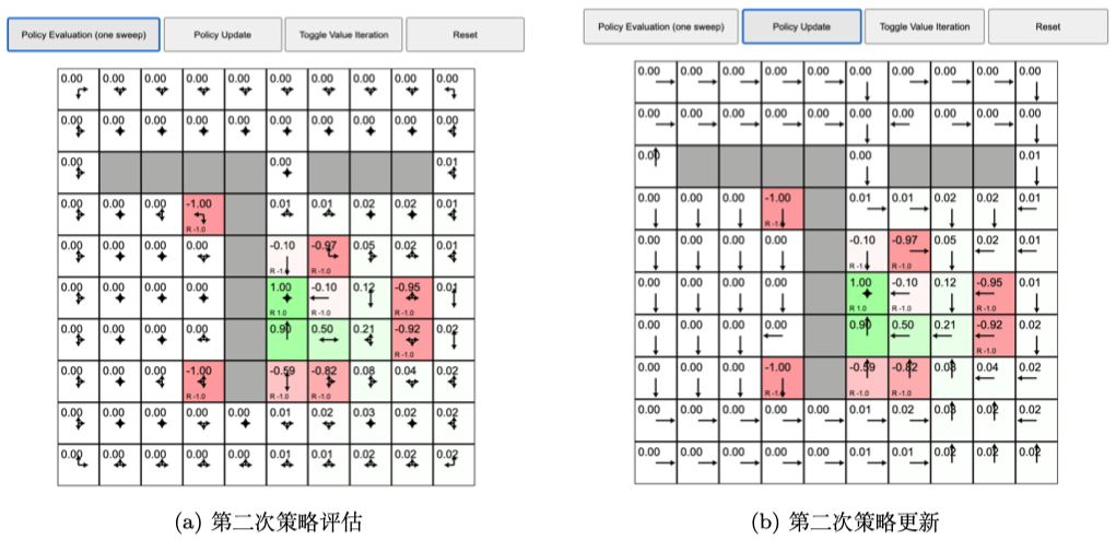 首先我们来看看策略迭代,之前的例子在每个状态都采取固定的随机策略,每个状态都以 0.25 的概率往上、下、左、右,没有策略的改变。但是我们现在想进行策略迭代,每个状态的策略都进行改变。如图 2.25a 所示,我们先执行一次策略评估,得到价值函数,每个状态都有一个价值函数。如图 2.25b 所示我们接着进行策略改进单击“策略更新policy update这时有些格子里面的策略已经产生变化。比如对于中间 $-$1 的这个状态,它的最佳策略是往下走。当我们到达 $-$1 状态后,我们应该往下走,这样就会得到最佳的价值。绿色右边的格子的策略也改变了,它现在选取的最佳策略是往左走,也就是在这个状态的时候,最佳策略应该是往左走。