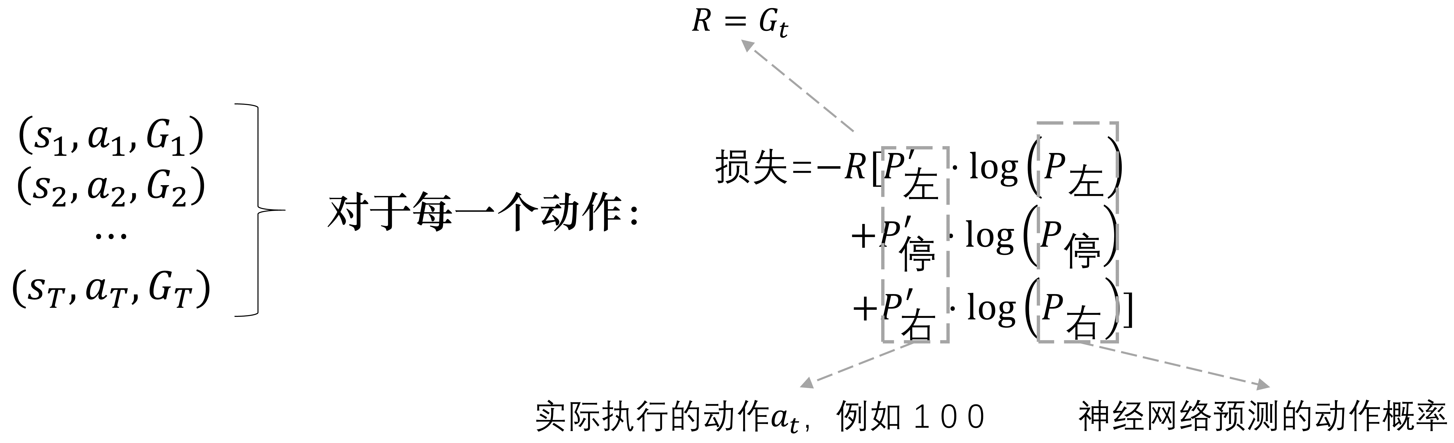 如图 4.19 所示,实际上我们在计算策略梯度损失的时候,要先对实际执行的动作取独热向量,再获取神经网络预测的动作概率,将它们相乘,我们就可以得到 $\log \pi(a_t|s_t,\theta)$,这就是我们要构造的损失。因为我们可以获取整个回合的所有的轨迹,所以我们可以对这一条轨迹里面的每个动作都去计算一个损失。把所有的损失加起来,我们再将其“扔”给 Adam 的优化器去自动更新参数就好了。