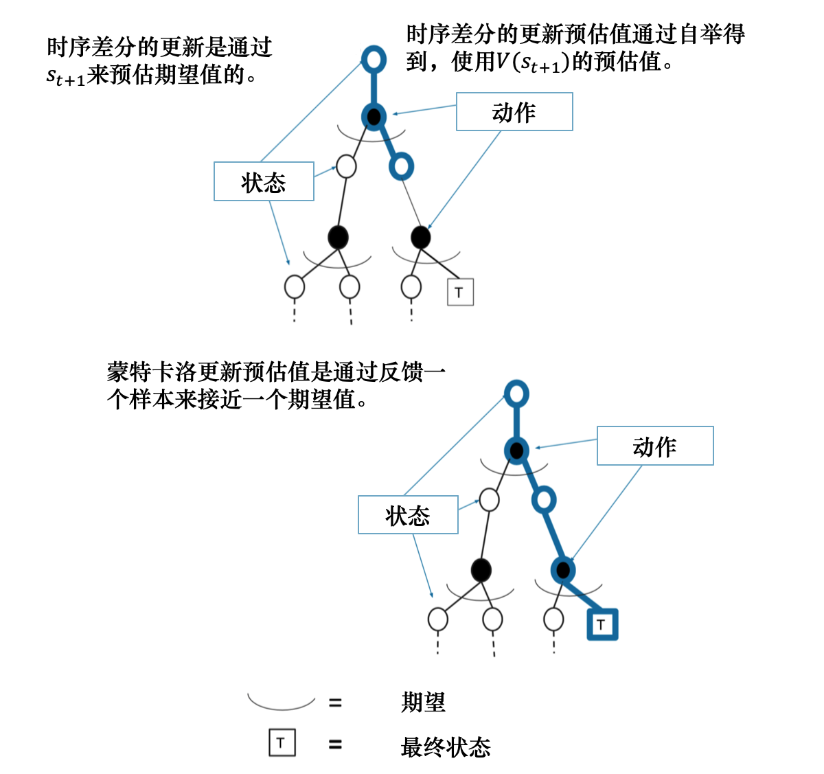 如图 3.13 所示,我们使用蒙特卡洛方法得到的轨迹对应树上蓝色的轨迹,轨迹上的状态已经是决定的,采取的动作也是已经决定的。我们现在只更新这条轨迹上的所有状态,与这条轨迹没有关系的状态都不进行更新。